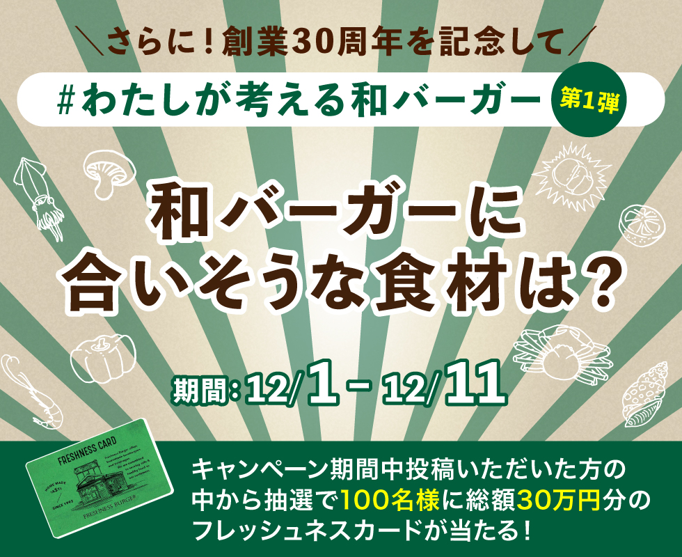 #わたしが考える和バーガー をつけて投票した方の中から、抽選でフレッシュネスカードを総額30万円を100名様にプレゼント!